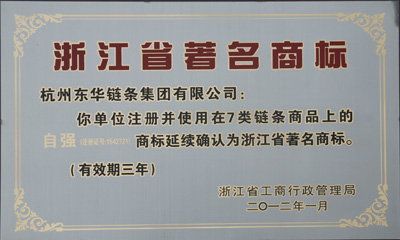 日前,東華集團注冊并使用在7類鏈條商品上的“自強”(注冊證號:1542721)商標被浙江省工商行政管理局延續(xù)確認為浙江省著名商標,有效期三年。“自強”商標為東華集團鏈條的三大品牌之一,在國內外鏈條行業(yè)享有較高知名度。
