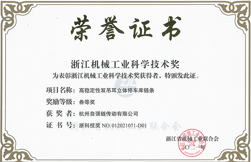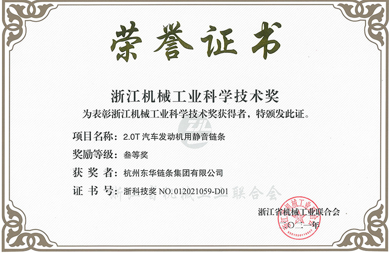 6月30日,浙江省機械工業聯合會召開會員大會。會上表彰2021年度浙江機械工業科學技術獎,全省機械領域共有72項科技創新項目獲獎。東華 “2.0T汽車發動機用靜音鏈條”和“高穩定性雙吊耳立體停車庫鏈條”均獲三等獎,這是東華產品創新項目連續十年榮獲浙江機械工業科技獎,也是2021年度全省機械行業科技創新成果獎中唯一鏈傳動企業的高端產品獲獎。